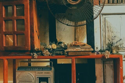 전축과 화이트 장식장구형 선풍기와 라디오